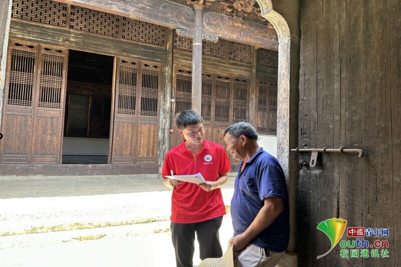 图为实践团成员采访侯村祠堂文物管理员。中国青年网通讯员 刘杰 摄